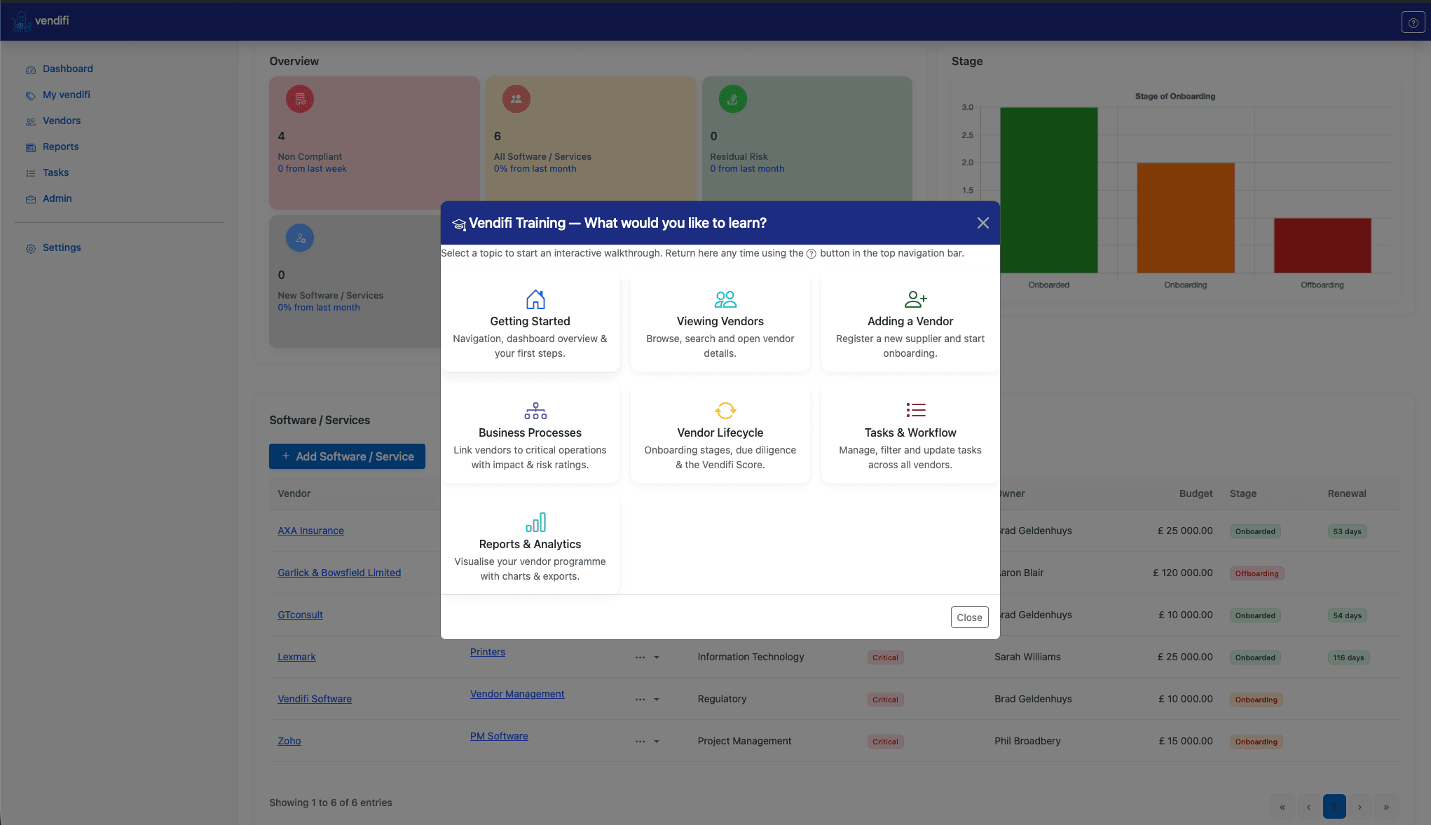 This tour is the best place to begin. It introduces the navigation sidebar, the five main sections (Dashboard, Vendors, Tasks, Reports, Admin) and shows you how the main content area updates as you move through the application.