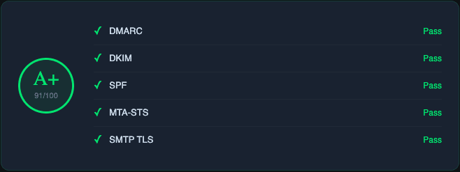 ☠️ Ransomware Group ActivityCross-references the sender's domain against known ransomware group threat intelligence — a uniquely powerful signal for vendor risk assessments. | 🔑 Breached CredentialsChecks whether any credentials from the sender's domain have appeared in known data breaches — indicating heightened account takeover risk. | 📊 Instant ScoringA composite security score from 0–100 with a letter grade, giving you an at-a-glance risk signal you can act on immediately. |